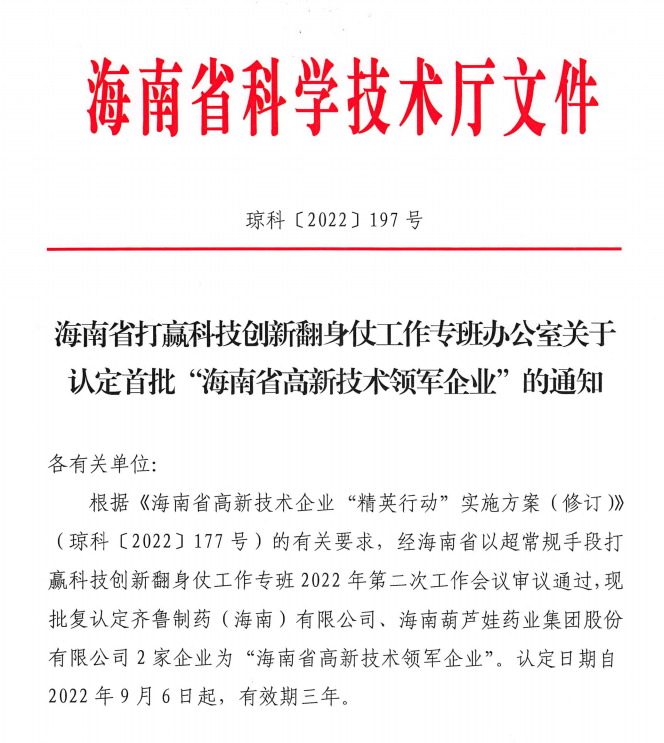 近日,海南省科学技术厅发布的《海南省打赢科技创新翻身仗工作专班办公室关于认定首批“海南省高新技术领军企业”的通知》中显示,批复认定海南ks凯时药业集团股份有限公司等2家企业为“海南省高新技术领军企业”。认定日期自2022年9月6日起,有效期三年。